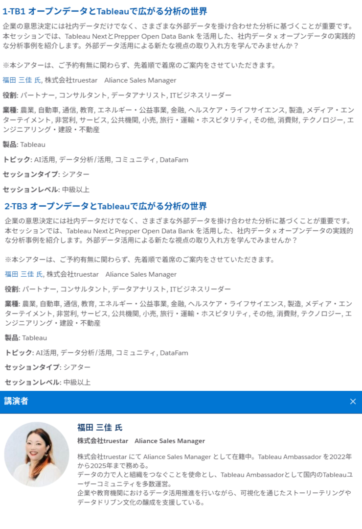 登壇セッションでは、Tableau NextとPrepper Open Data Bankを活用し、社内データ × オープンデータを統合した実践的な分析事例をご紹介します。